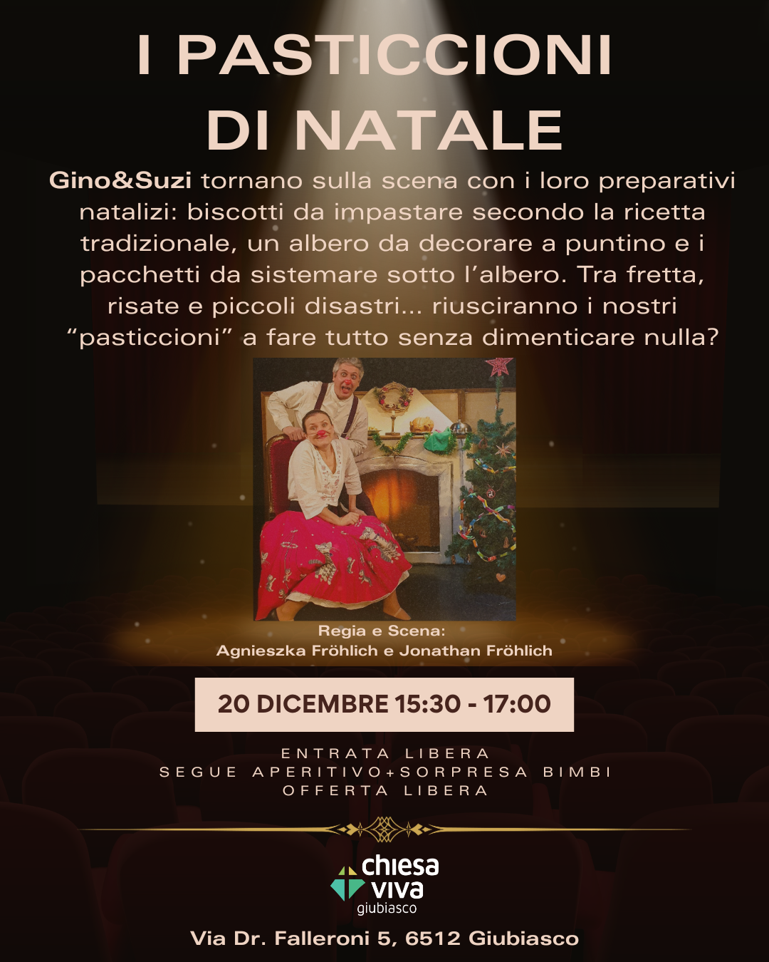 “I Pasticcioni di Natale” è uno spettacolo che porta sul palco la gioia semplice e vivace dei preparativi natalizi. Gino e Suzi tornano in scena con tutta la loro energia, i loro impasti da preparare secondo la ricetta tradizionale, l’albero da addobbare con precisione e i pacchetti da sistemare sotto l’albero senza dimenticare nulla. Tra risate, piccoli disastri, momenti buffi e una tenera confusione familiare, ci accompagnano in un pomeriggio che parla ai bambini e agli adulti con la stessa leggerezza. Lo spettacolo, scritto, diretto e interpretato da Agnieszka Fröhlich e Jonathan Fröhlich, ci ricorda che la bellezza del Natale non sta nella perfezione ma nel far spazio alla gioia, nel condividere il tempo e nel vivere insieme la meraviglia di questo periodo speciale.